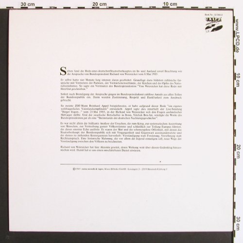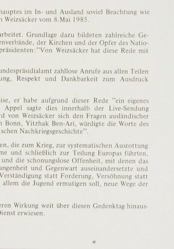 | Y1958 | LP | von Weizsäcker,Richard: Bundespräsident zum 8.Mai 1985, Extra(66.23614), D, 1985, p1 p2 p3 • anläßlich des 40.Jahrestages der deutschen Kapitulation. +Info. | 9,00 Euro |