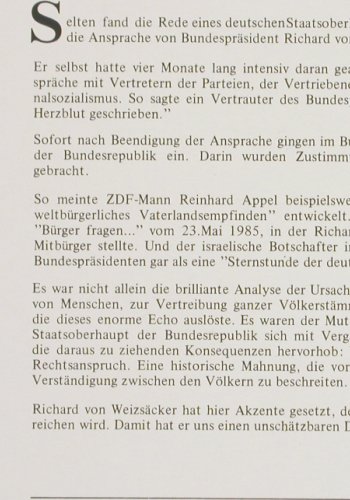 | Y1957 | LP | von Weizsäcker,Richard: Bundespräsident zum 8.Mai 1985,Foc, Philips(0647 187), D, 1985, p1 p2 p3 | 7,50 Euro |