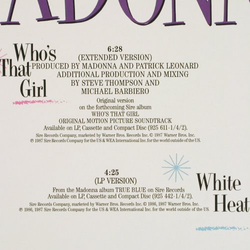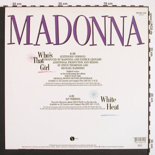| V7092 | 12" | No. 3/1 Madonna: Who's That Girl (6:28)/White Heat, Sire(920 692-0), D, 1986, p1 p2 p3 | 6,00 Euro |