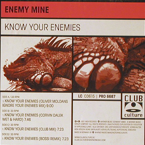 | V6343 | 12"*2 | Enemy Mine: Know Your Enemy*4, Club Culture(PRO 6687), D, 2001, p1 p2 p3 | 9,00 Euro |