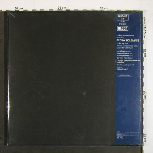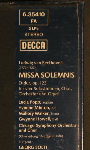 | K1544 | 2LP | Beethoven,Ludwig van: Missa Solemnis, Box, FS-New sealed, Decca(6.35410 FA), D, 1978, p1 p2 p3 p4 • Lucia Popp, Yvonne Minton, Mallory Walker.., Chicago Symphony Orchestra, Georg Solti. | 20,00 Euro |