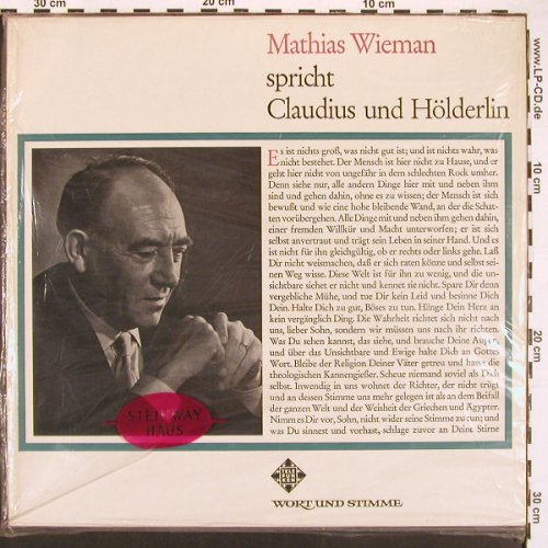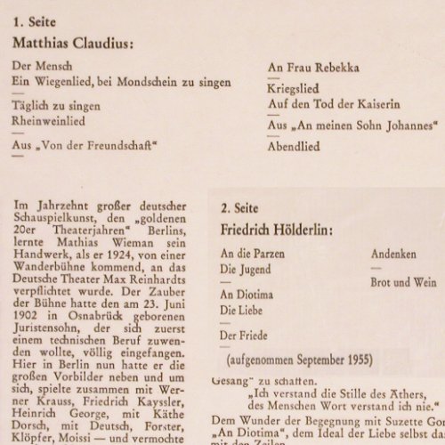 | V6145 | LP | Wieman,Mathias: spricht Claudius & Hölderlin (1955), Telefunken sealed(TSC 13 419), D, FS-New, p1 p2 p3 | 15,00 Euro |